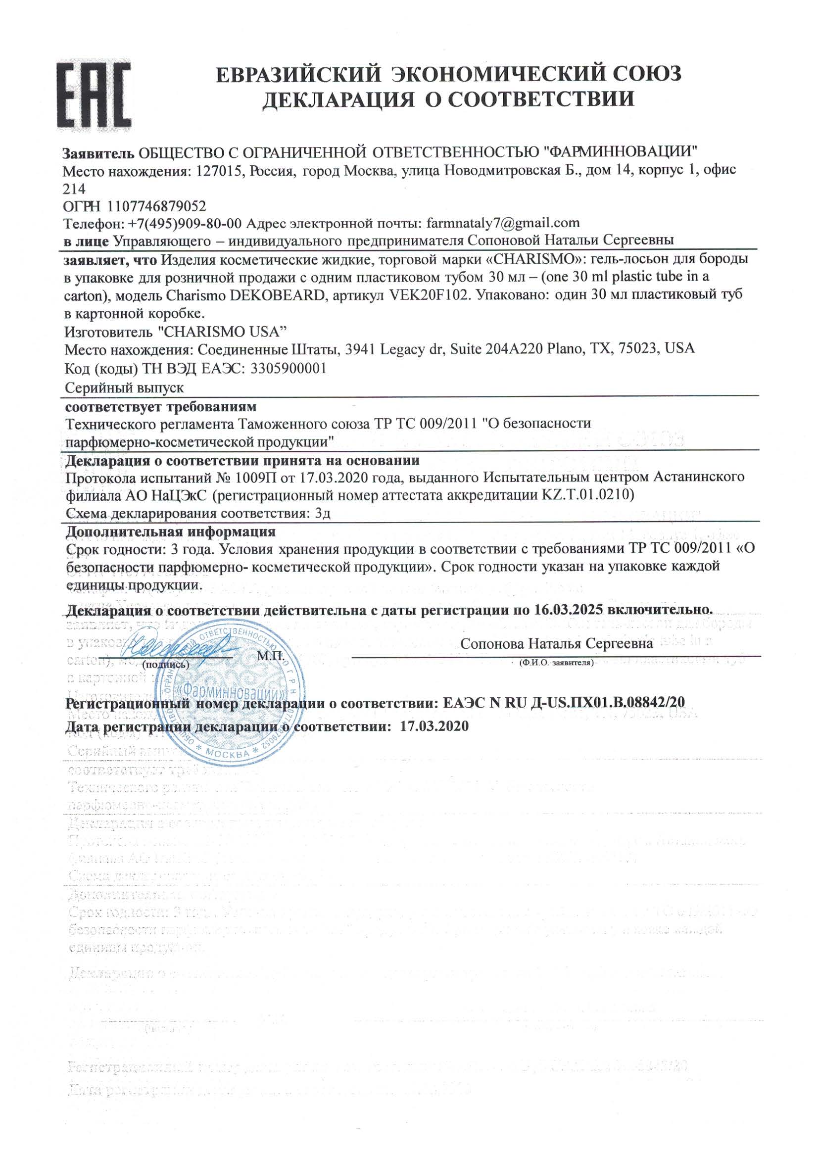 DEKOBEARD – гель-активатор для восстановления роста волос и для остановки их интенсивного выпадения в зоне бороды и усов от компании CharismoUSA, Corp. Разработан и производится в США (Даллас, Техас) на высокотехнологичном производстве с соблюдением высочайших мировых стандартов: